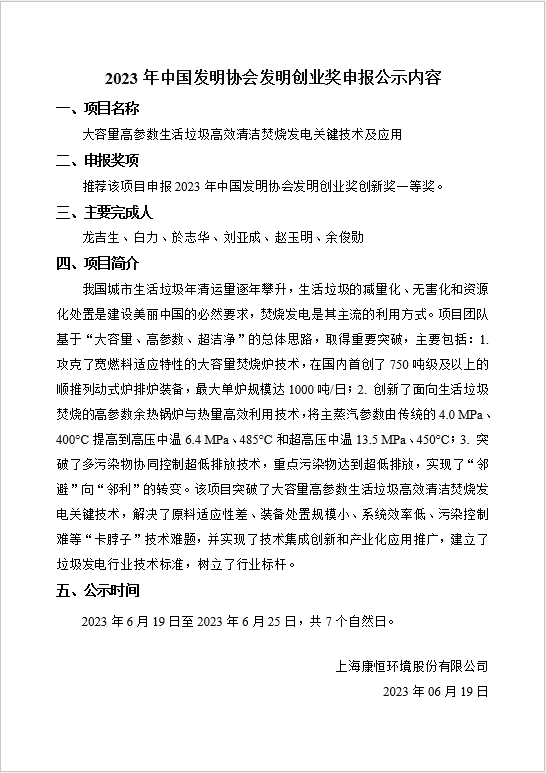 根據(jù)《中國發(fā)明協(xié)會關于2023年度“發(fā)明創(chuàng)業(yè)獎”評選工作的通知》(中發(fā)協(xié)字〔2023〕19號),我單位參與完成的項目申報發(fā)明創(chuàng)業(yè)獎,需對相關信息予以公示。本項目名稱為“大容量高參數(shù)生活垃圾高效清潔焚燒發(fā)電關鍵技術及應用”,公示日期自2023年6月19日至2023年6月25日止(7個自然日)。在公示期內(nèi),對本項目如有異議,請以書面形式提出。單位提出異議的須加蓋單位公章,個人提出異議的須簽署真實姓名和單位(不得打印,匿名異議不予受理),異議材料送康恒環(huán)境研究院處。